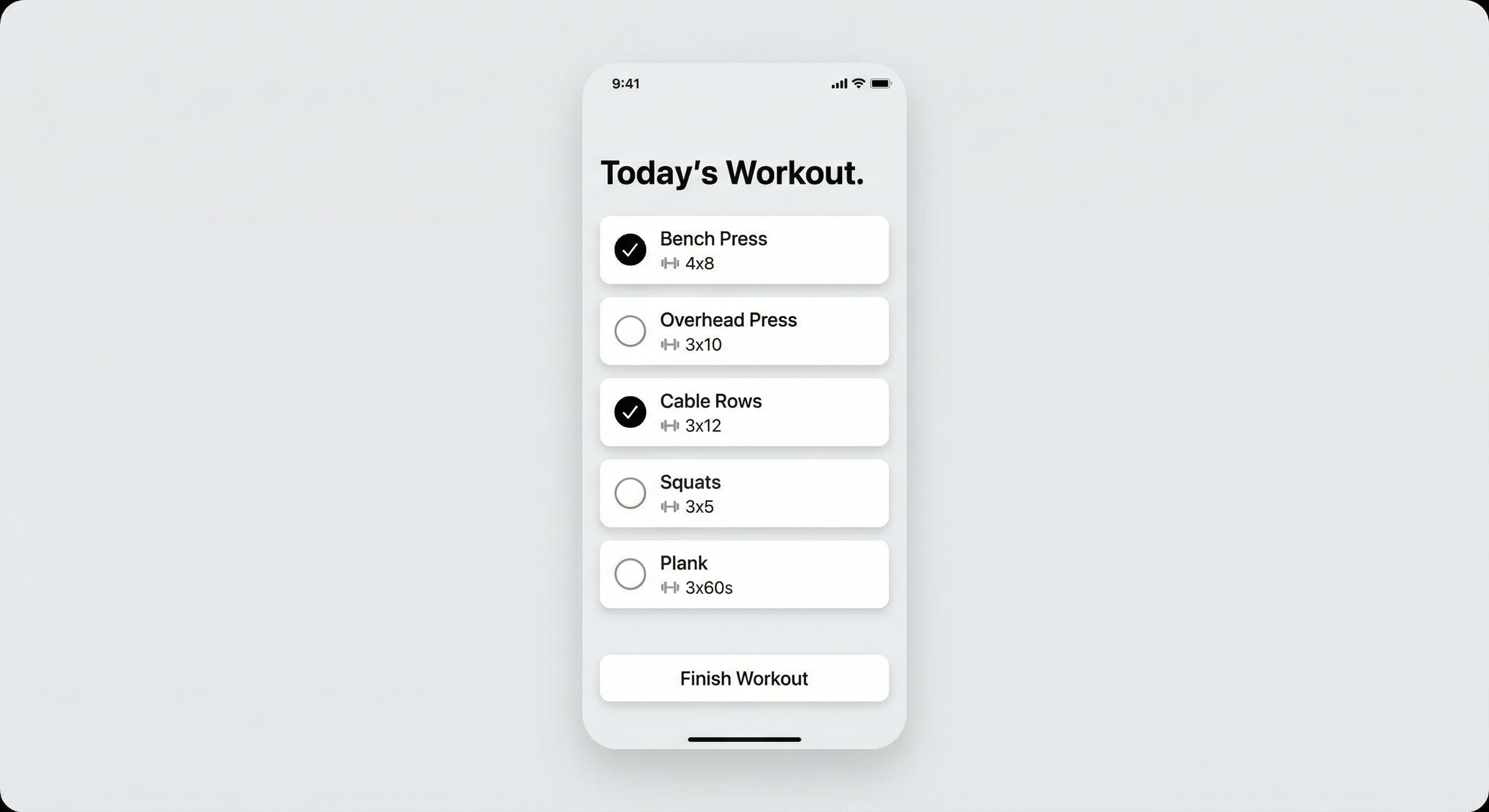 Your app is designed for one-handed use at the gym — large tap targets, readable text, and a layout that works on any phone screen.